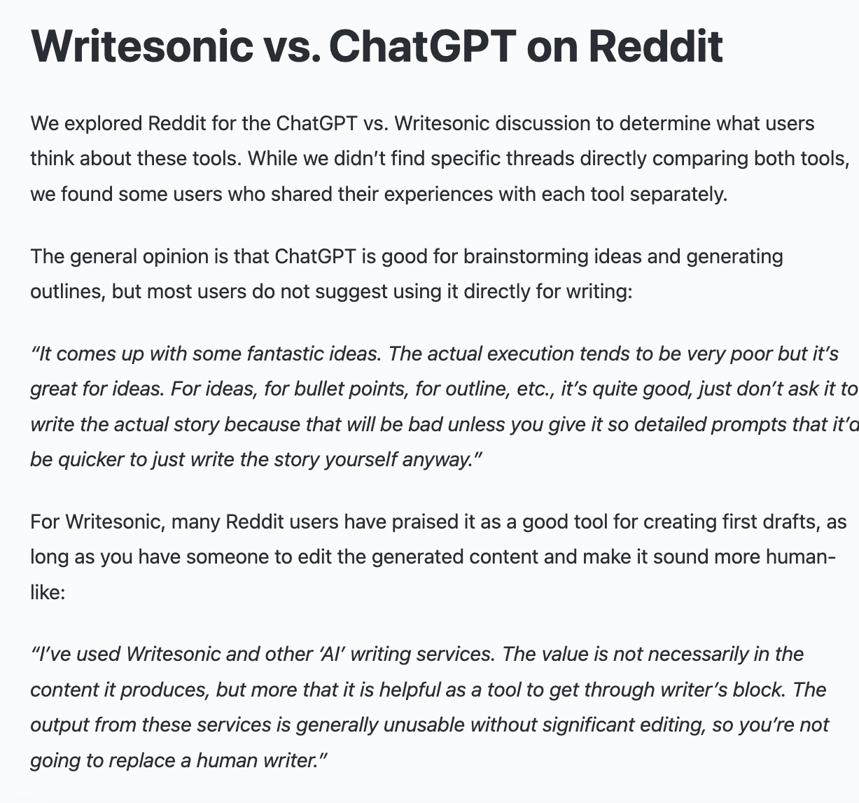 Now if you check the article, you’ll see a special section there- Writesonic vs. ChatGPT on Reddit.
