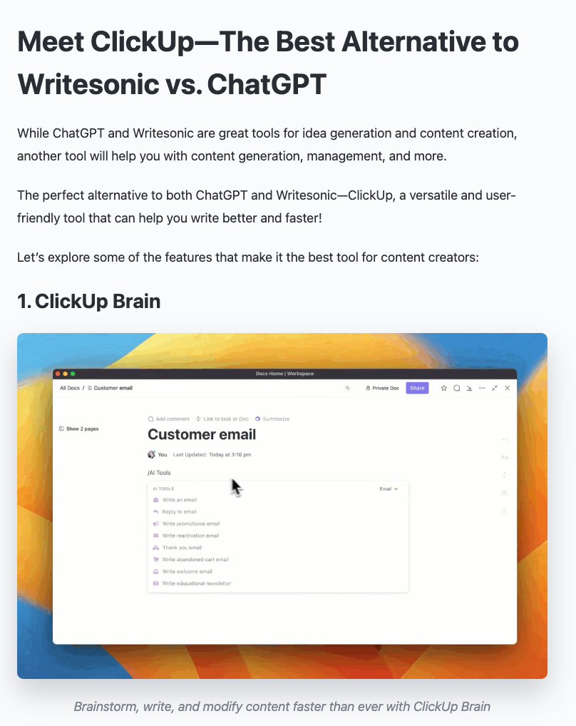 ClickUp’s approach of comparing popular products (Writesonic and ChatGPT) serves as an indirect promotion. By creating content around a popular topic, they can draw in a wider audience who might not have been looking for ClickUp specifically but are interested in AI writing tools.