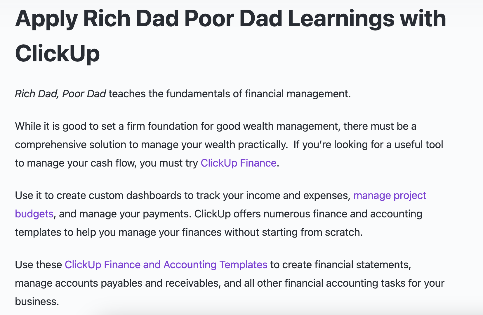 - Reach a Wider Audience: By including book summaries, ClickUp attracts not only those looking for project management tools but also readers interested in self-improvement, business, and productivity topics, thereby expanding their potential customer base.